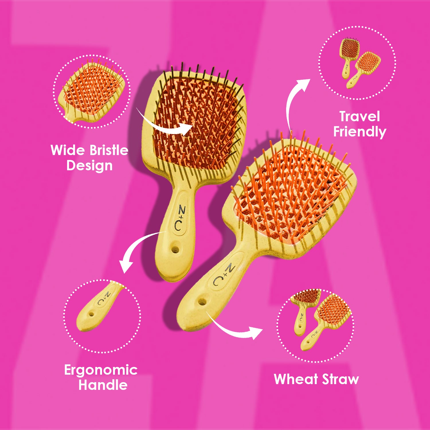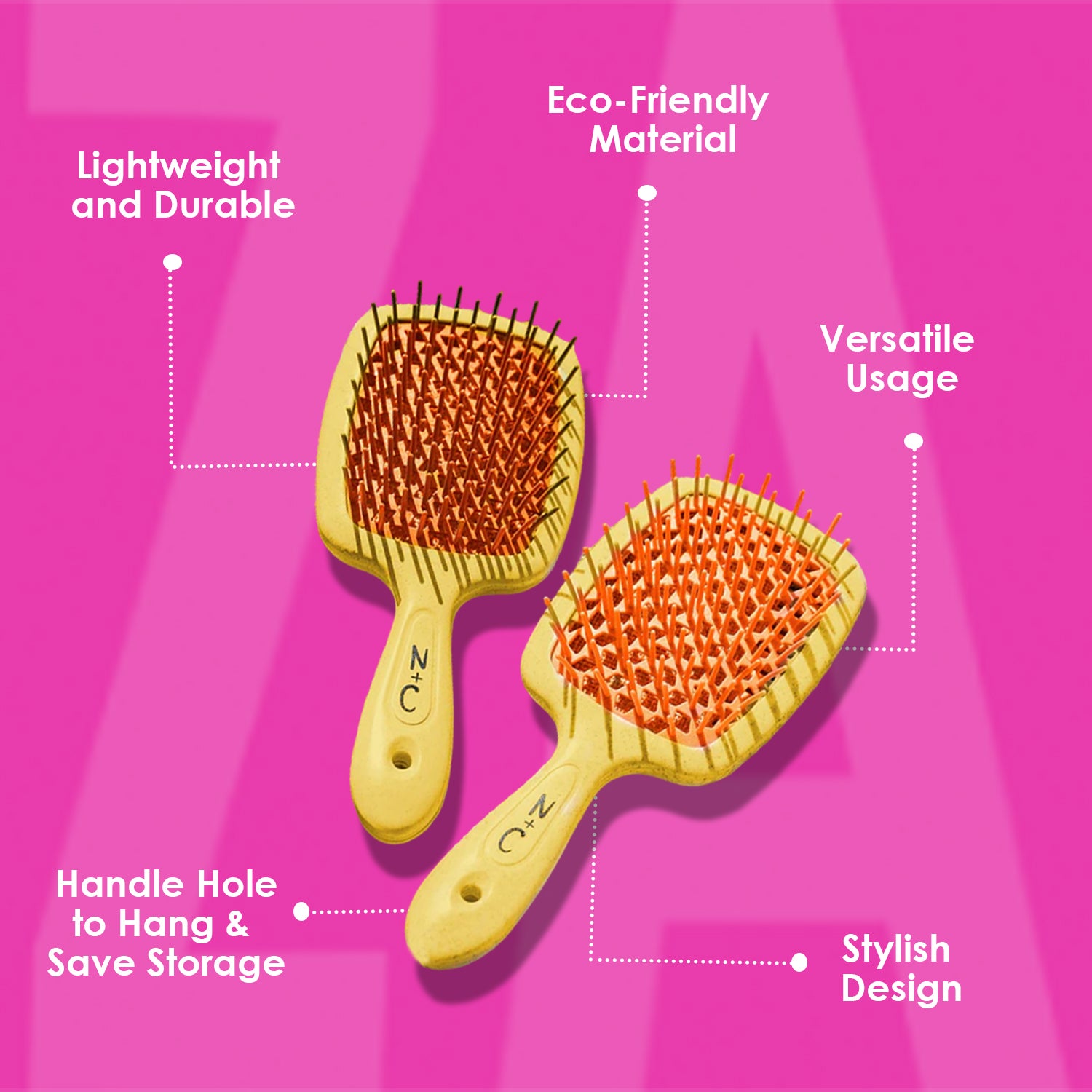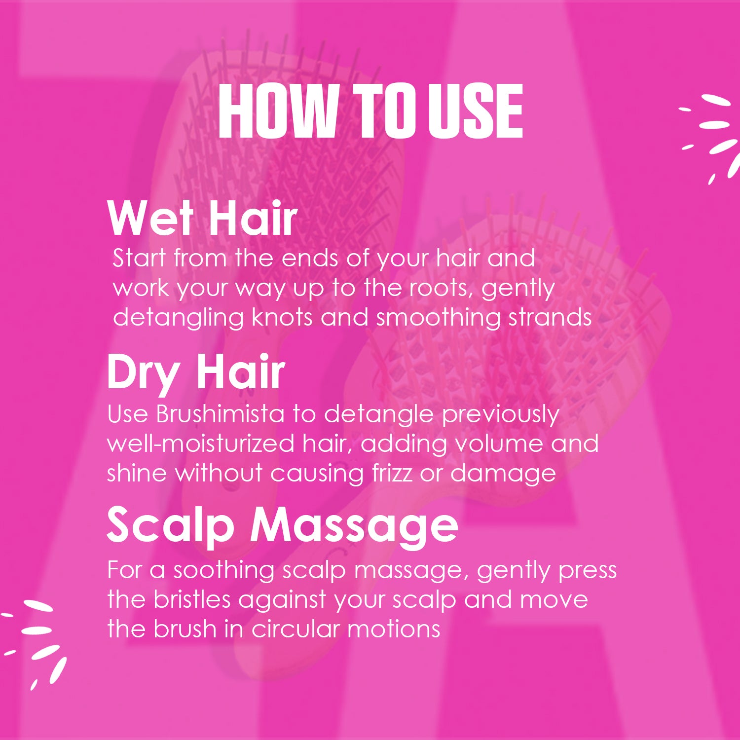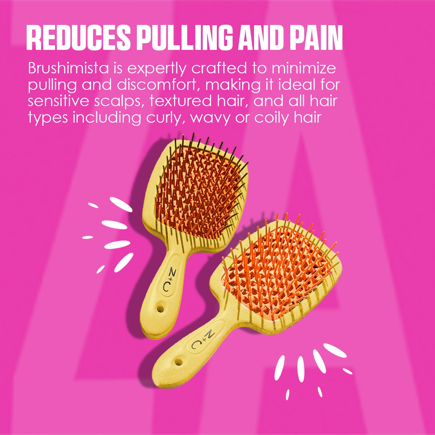 Meet Tangles Shmangles' Bestie: Brushimista, the Mane Tamer! The Brushimista is the ultimate knot-busting hero that makes your hair super stretchy, soothes your scalp, eliminates pulling, and zaps every knot. Whether your hair is wet or dry, Brushimista and its hollow air design works wonders to detangle or style. Get ready to turn your tangles into a work of art!