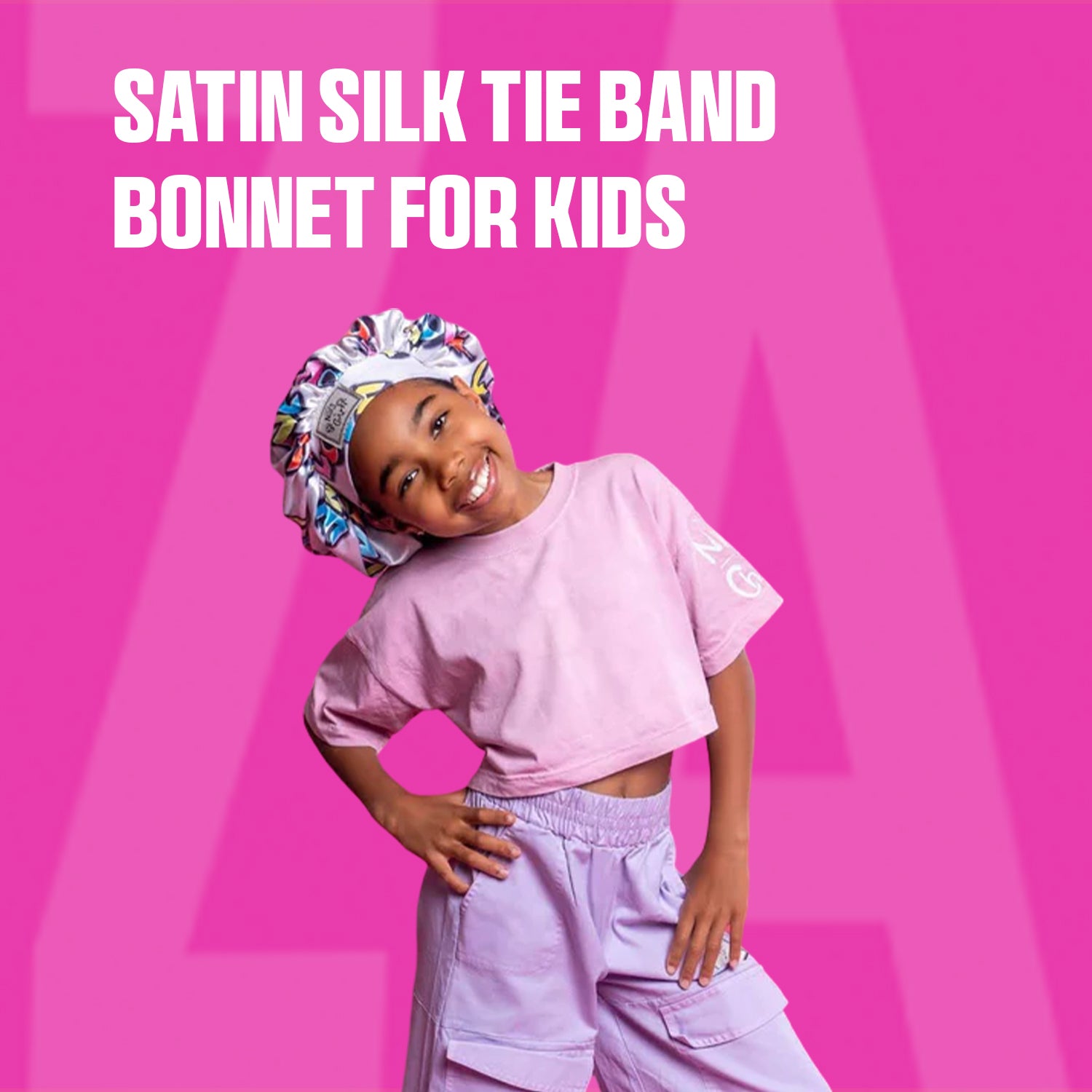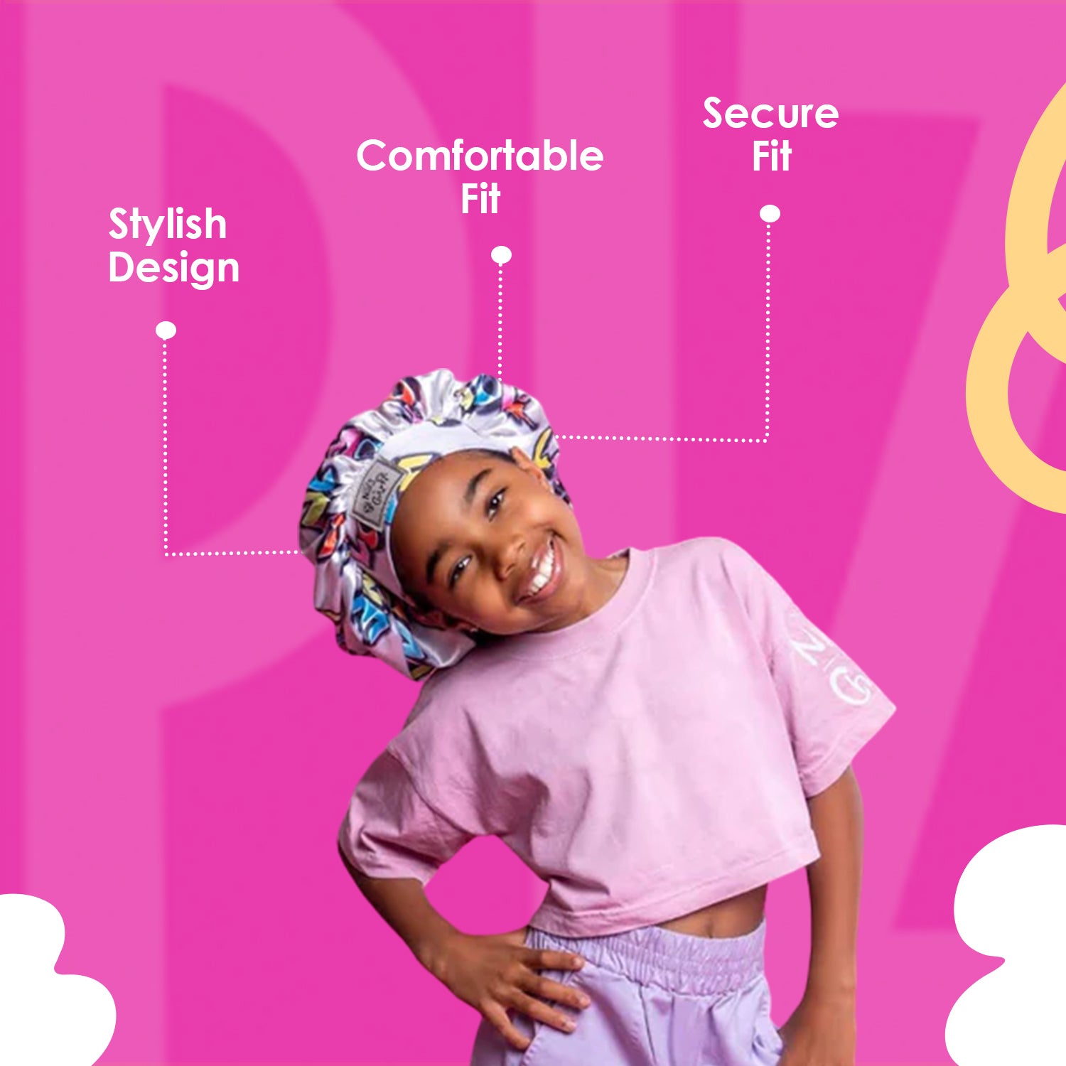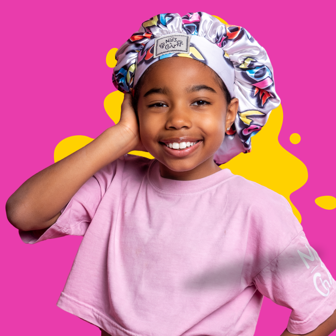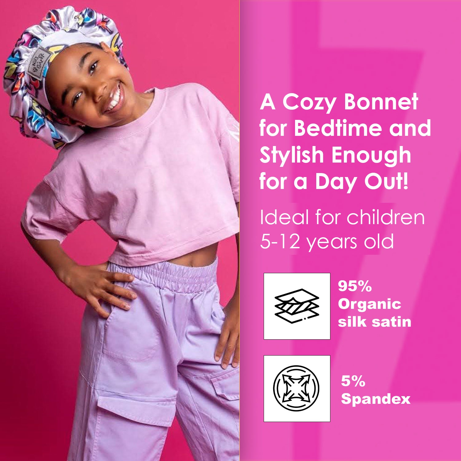 This organic silk satin bonnet shields your child's curls from tangles and environmental stressors, keeping their hair safe for day and night adventures. Say hello to happy hair and a happier planet with our stylish, biodegradable bonnet!